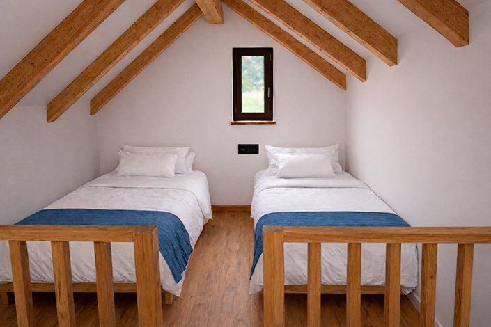Planta alta con dos camas individuales en una cabaña en Carnota